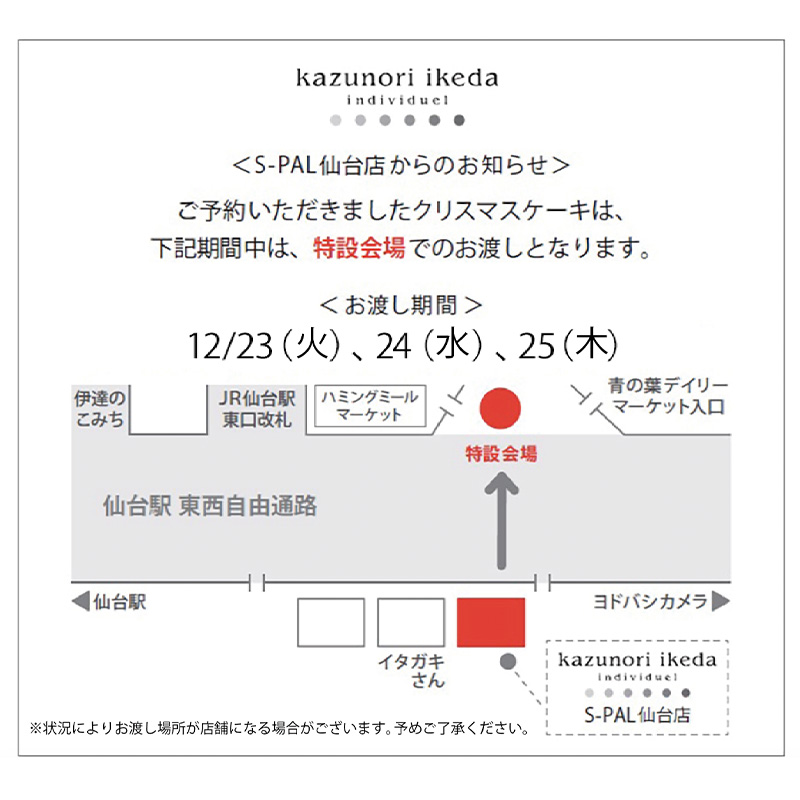 ※エスパル仙台店は混雑防止のため、12/23~12/25は特設会場でお渡しします。 この期間中でも混雑具合によって、店舗になる場合がございます。ご了承ください。